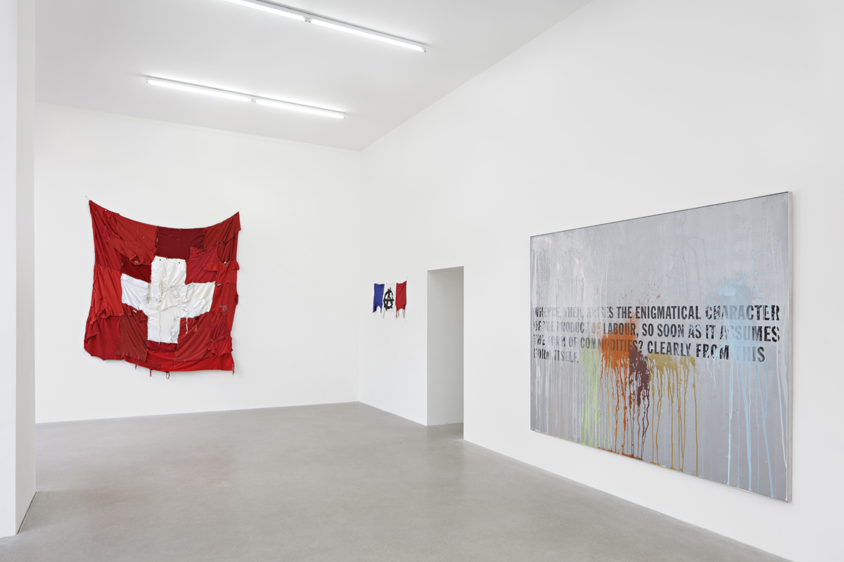 Andere Arbeiten setzen Zitate unterschiedlicher Autoren in großen Blockbuchstaben ins Bild, „kommentiert“ durch Farbbeutel, die auf der Bildoberfläche zersprungen sind. Die Zitate sind gelegentlich Klassikern der marxistischen Wirtschaftstheorie entnommen, wie z. B. Karl Marx oder Alfred Sohn-Rethel, oder offiziellen Dokumenten, wie z. B. der UNO-Konvention gegen Folter.[2] Exemplarisch ist die Serie „Marx-Arbeiten“ mit Textfragmenten aus Das Kapital von Karl Marx.